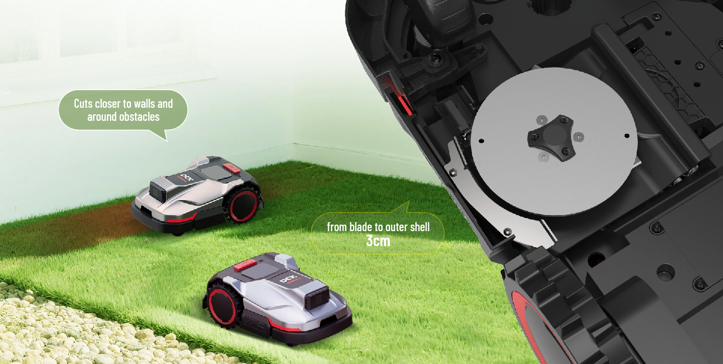 Благодарение на сензорите за избягване на препятствия (Flash LiDAR + сензор за сблъсък), роботът разпознава малки обекти (от около 3 см) и работи безопасно, дори в градини с мебели, бордюри или декоративни елементи. Освен това може да изкачва наклони до 45%, което го прави подходящ и за леко неравен терен.